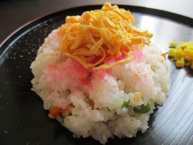 昼食にちらし寿司をおやつにようかんとだんごを頂きました👏