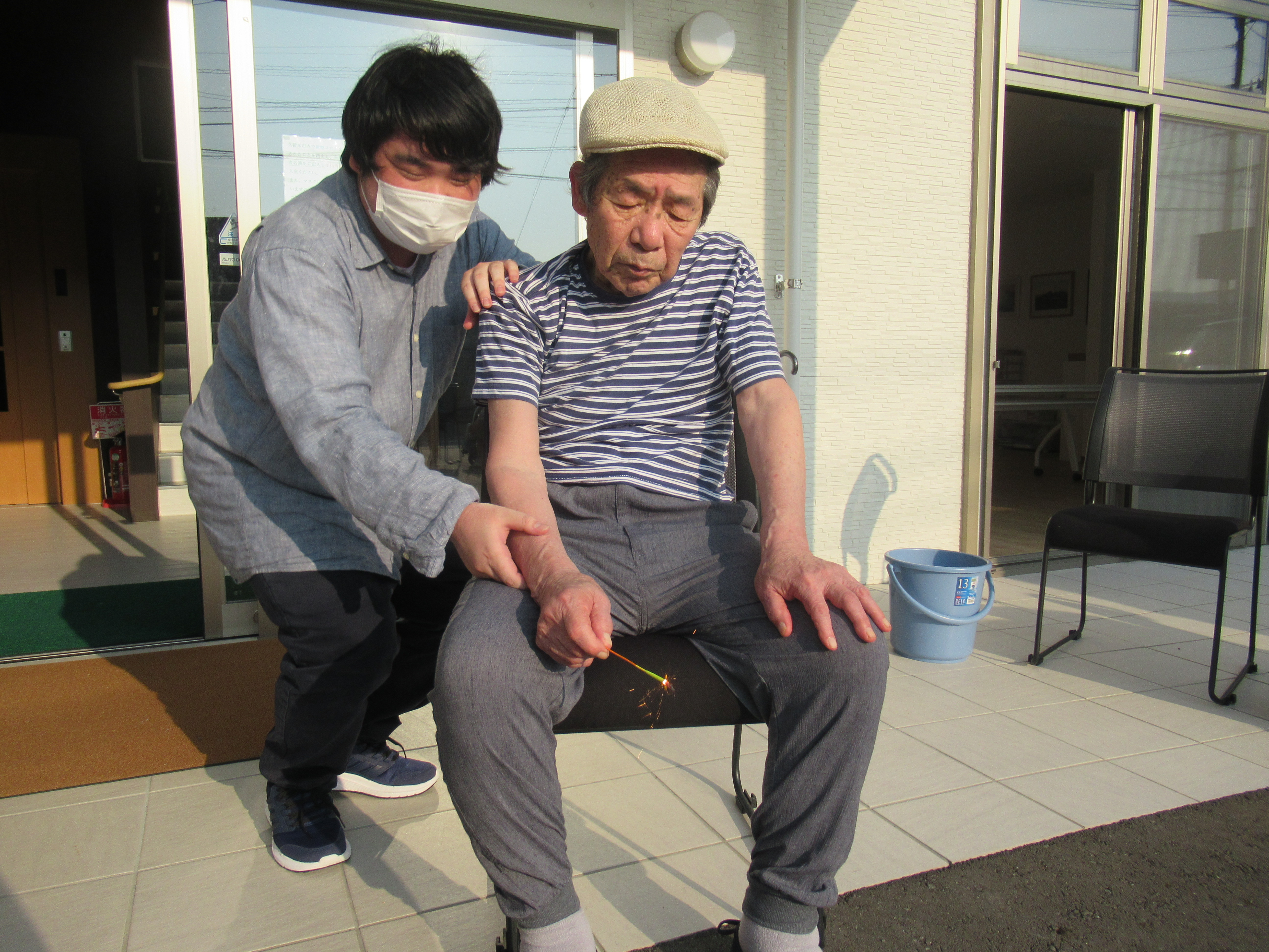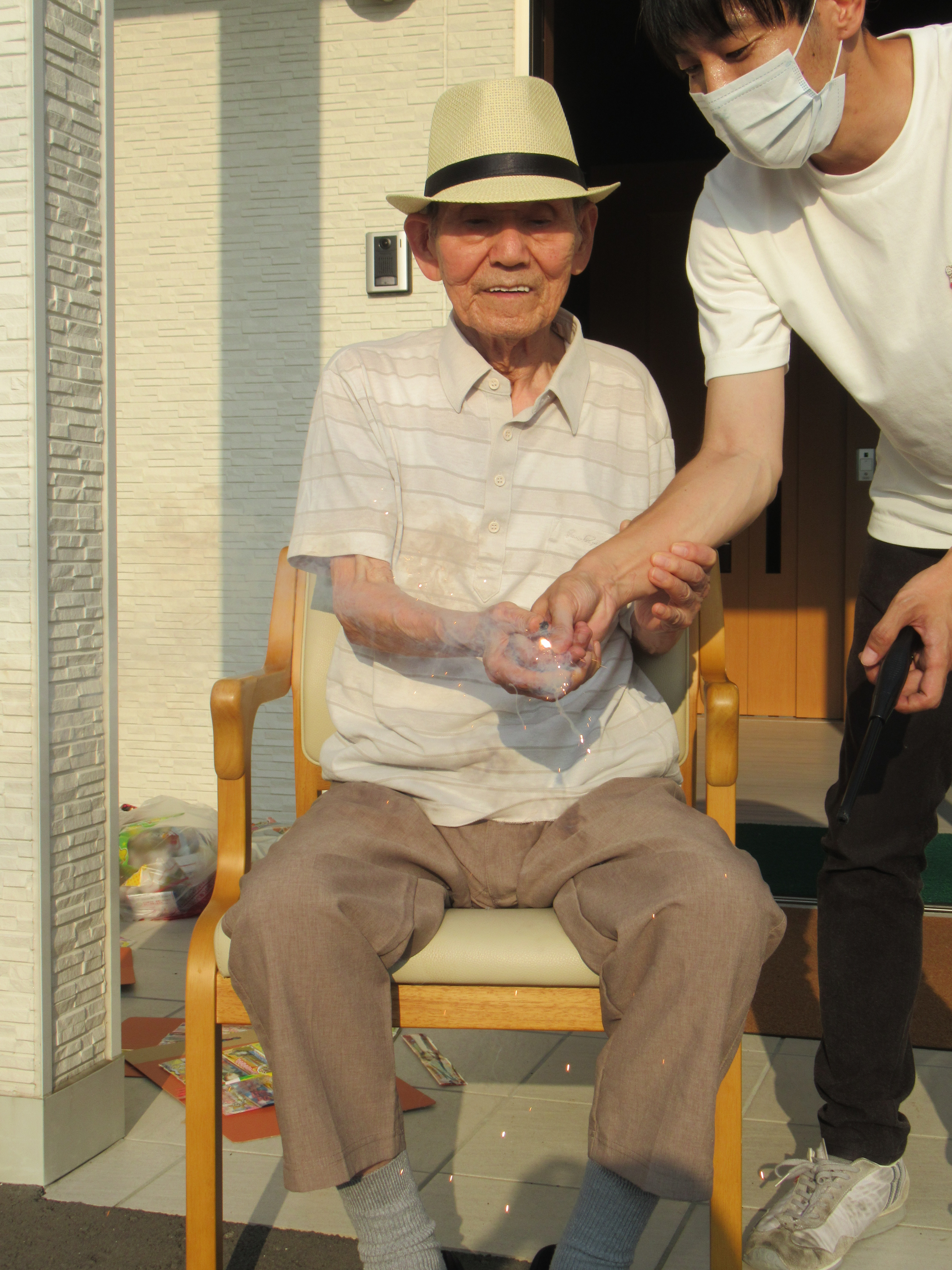 グループホーム唱和では夏らしさを感じてもらう為に駐車場にて花火を行いました。とても暑かったですが、来年はもう少し涼しい時間に行ないたいと思います!(^^)!
