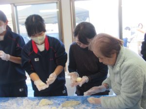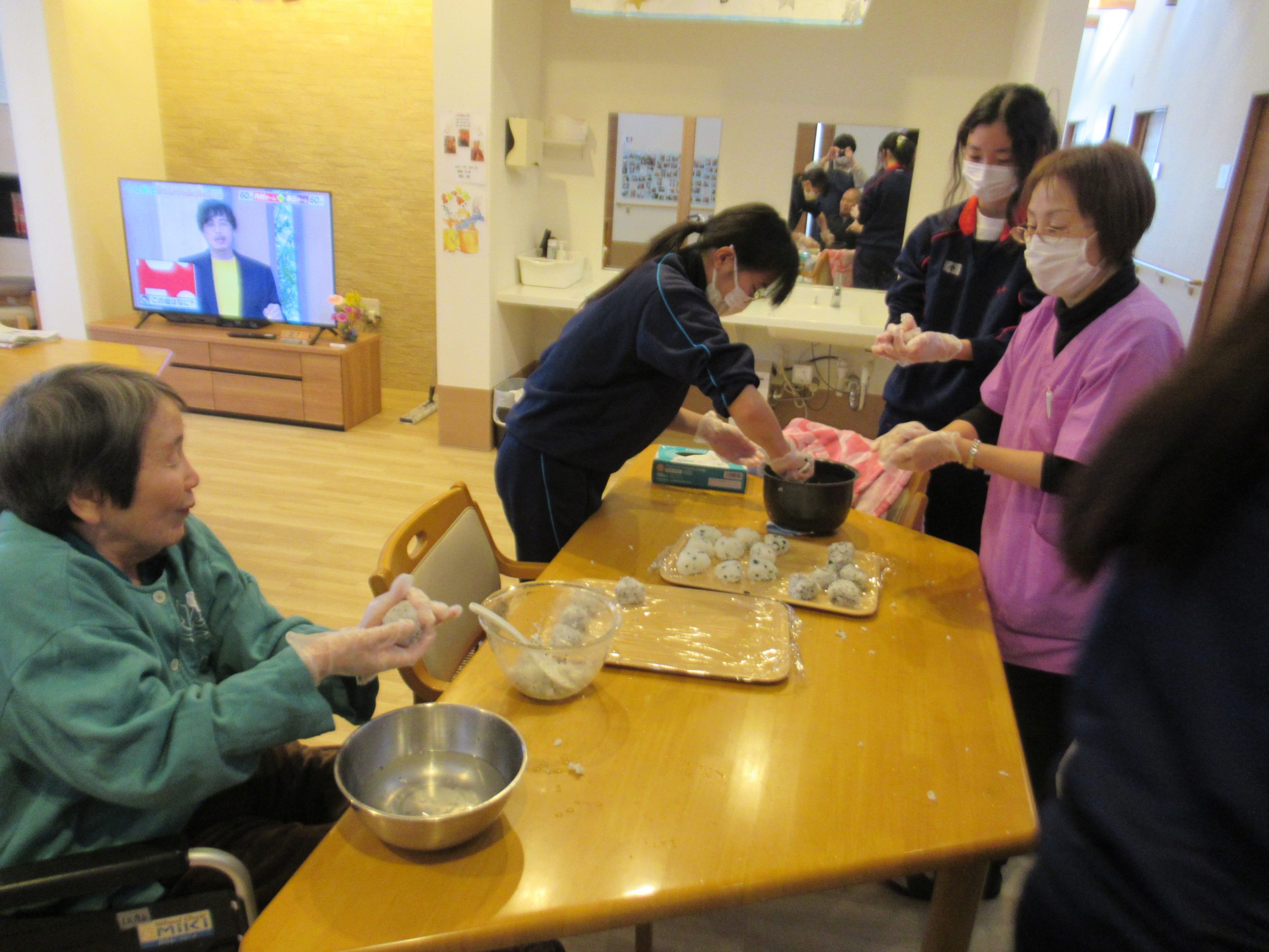 餅つき班、餅丸め班、昼食準備班とグループに分かれてローテーションしながら、楽しそうに入居者様とコミュニケーションをとられていました。